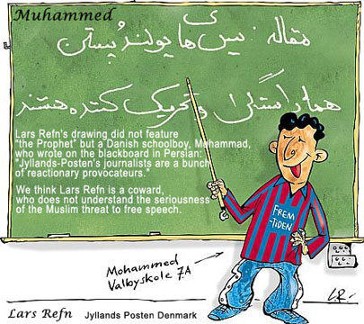 One of the cartoons, drawn by Lars Refn, prophesized the “seriousness of the Muslim threat to free speech.” Refn drew a student named Mohammad in front of a chalkboard on which is written in Farsi “Jyllands-Posten’s journalists are all reactionary provocateurs.” The paper has since apologized for offending Muslims, but maintains that “the 12 drawings were sober. They were not intended to be offensive, nor were they at variance with Danish law, but they have indisputably offended many Muslims for which we apologize.”