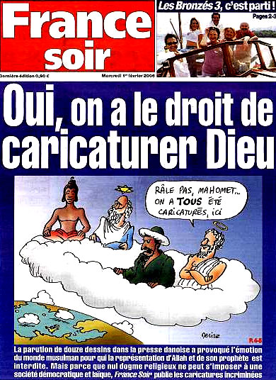 But now Jyllands-Posten’s apology and the Danish government’s damage-control efforts are becoming irrelevant, as other European papers and governments, led by the French in their assiduous thirst for freedom, have come once again to the defense of freedom of speech. On Wednesday, February 1, France Soir published the twelve original cartoons and added an additional one in which Buddhist, Jewish, Christian holy figures console the Muslim Prophet, “Don’t worry Muhammad, we’ve all been caricatured here.”