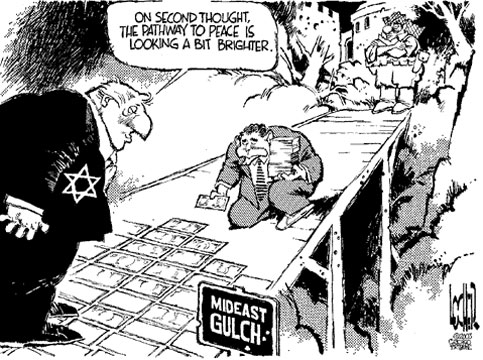 The Sharon figure exclaims, “On second though, the pathway to peace is looking a bit brighter.” The confident Yasser Arafat awaits him on the other side. It is not hard to see the anti-Semitic insinuation of the cartoon, as it invokes a stereotypical portrayal of “the avaricious Jew” who would do any deed for money. Anything that resembles Nazi propaganda rightfully generates anxiety and anger among Jewish people. There is no satire in cartoons which remind us how historic degradation of European Jews justified their massacre.